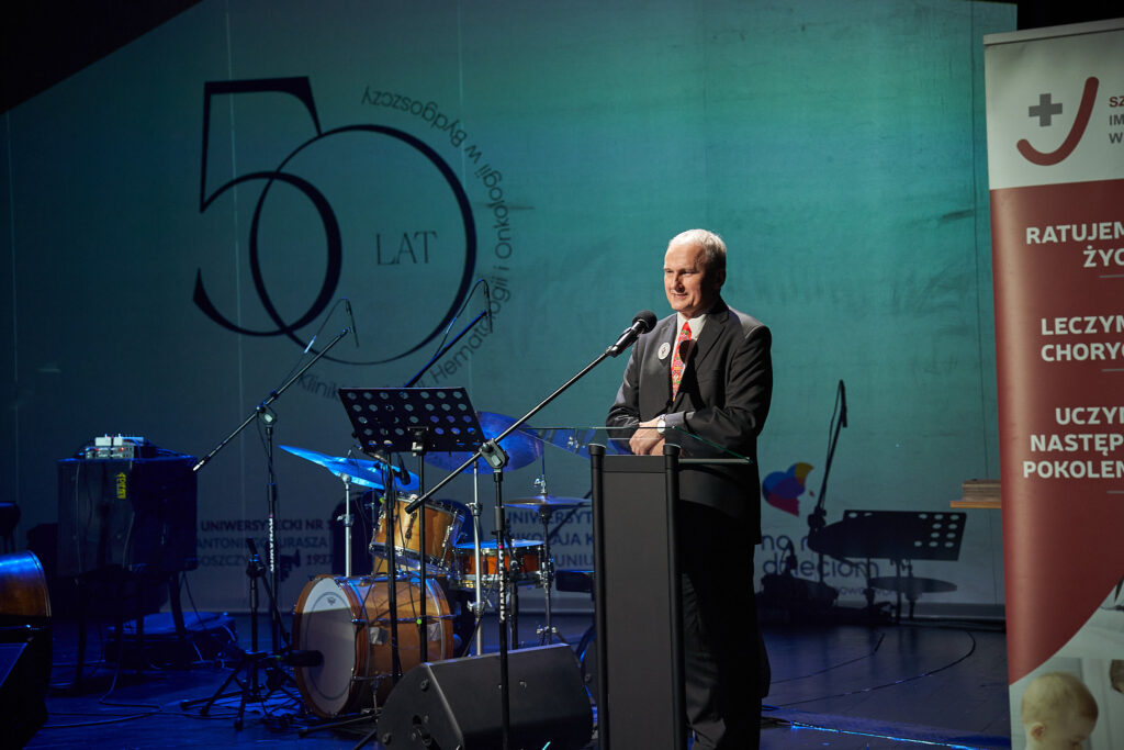 W czwartek 4 września 2025 roku w Teatrze Kameralnym w Bydgoszczy odbyła się Uroczysta Gala z okazji 50-lecia Kliniki Pediatrii, Hematologii i Onkologii Szpitala Uniwersyteckiego nr 1 im. dr. A. Jurasza w Bydgoszczy. Wydarzenie zgromadziło licznych gości – przedstawicieli władz państwowych, samorządowych, uniwersyteckich, dyrektorów bydgoskich szpitali, środowiska medycznego, rodziców i pacjentów, a także obecnych i byłych pracowników Kliniki. Patronat Honorowy nad obchodami 50-lecia Kliniki objęli Wojewoda Kujawsko-Pomorski Michał Sztybel oraz Prezydent Miasta Bydgoszczy Rafał Bruski. Gości przywitał prof. Jan Styczyński, kierownik Kliniki Pediatrii, Hematologii i Onkologii. W swoim wystąpieniu podkreślił wyjątkową rolę kliniki w rozwoju pediatrii i onkologii dziecięcej w Polsce oraz znaczenie pracy całego zespołu dla ratowania życia najmłodszych pacjentów. Jednym z najbardziej wzruszających momentów wieczoru była ceremonia wręczenia Odznak Honorowych „Za zasługi dla ochrony zdrowia”. Odznaczenia, przyznane przez Minister Zdrowia a wręczone przez Wicewojewodę Kujawsko-Pomorskiego Piotra Hemmerlinga otrzymało 20 osób – lekarze, pielęgniarki, diagności i opiekunowie medyczni związani z Kliniką: